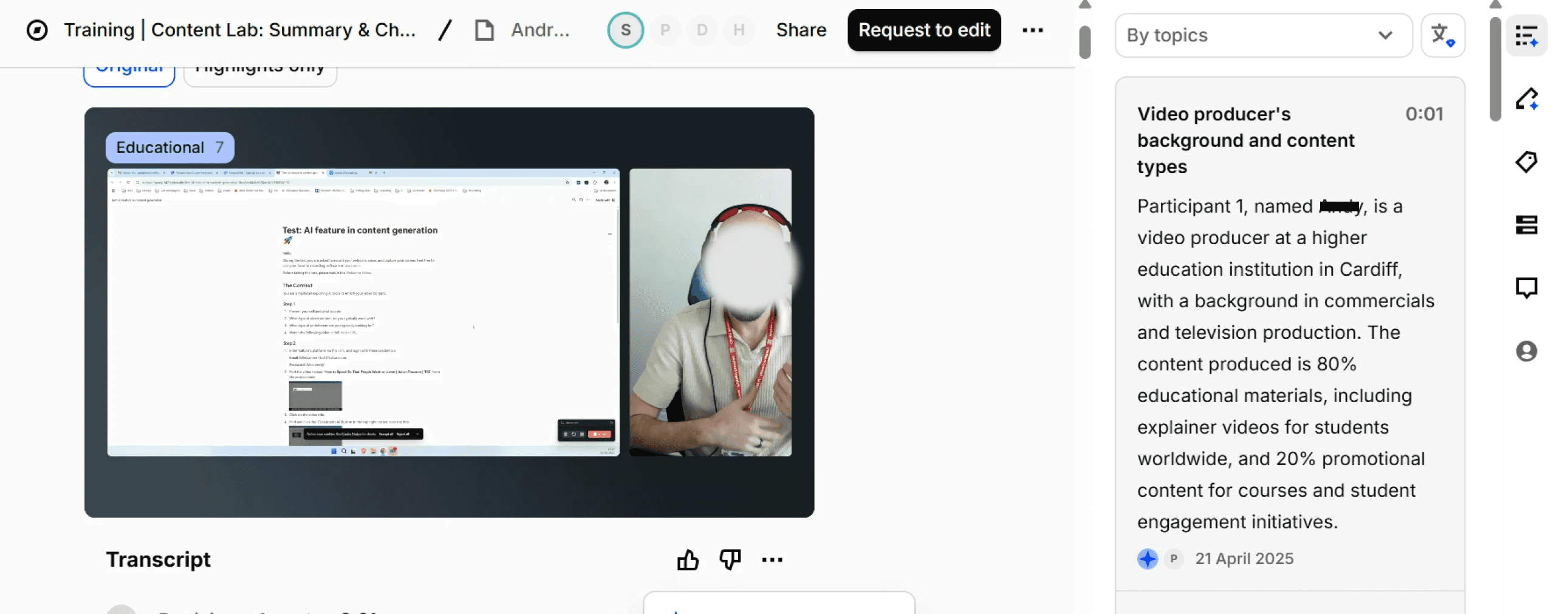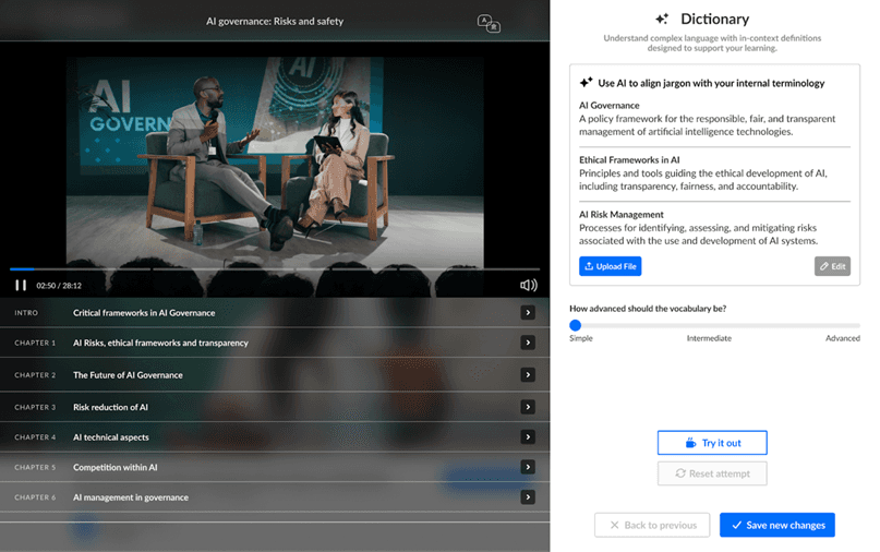 Reduce time-to-content-creation by helping users quickly generate summaries of lectures, trainings, or videos, lowering cognitive load and improving efficiency.