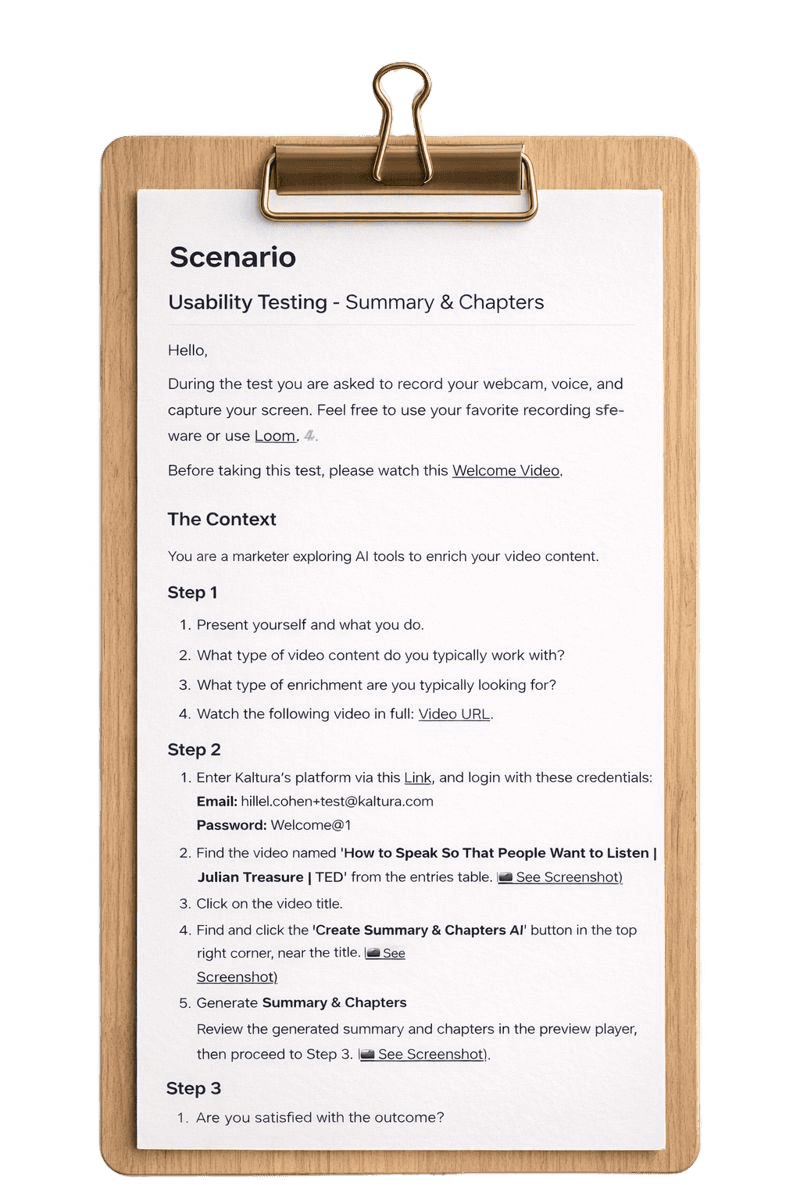 Participants were asked to complete a structured scenario that reflected real workflows inside Kaltura.
