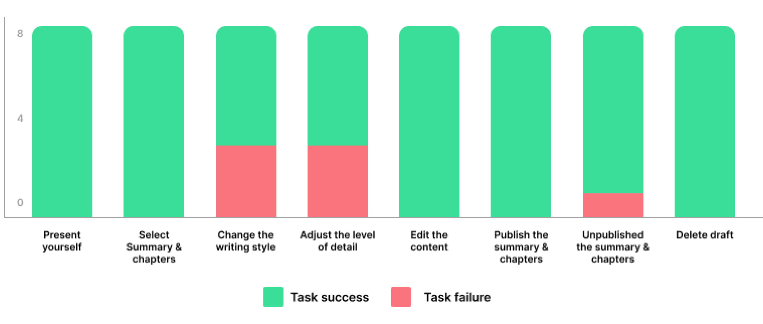 After observing 8 participants performing the Summary & Chapters flow, we measured the success rate for each step.