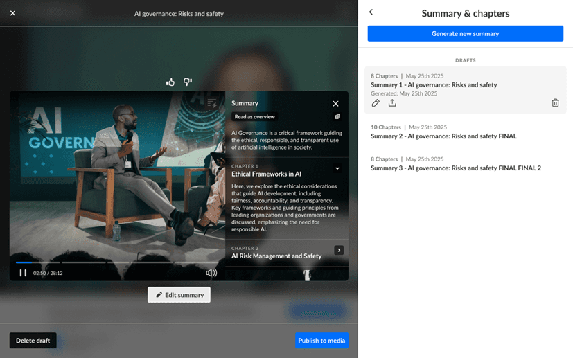 Key actions (Edit, Delete, Publish) were repositioned to intuitive locations, and the new right-side draft panel helps users easily manage all created summaries.