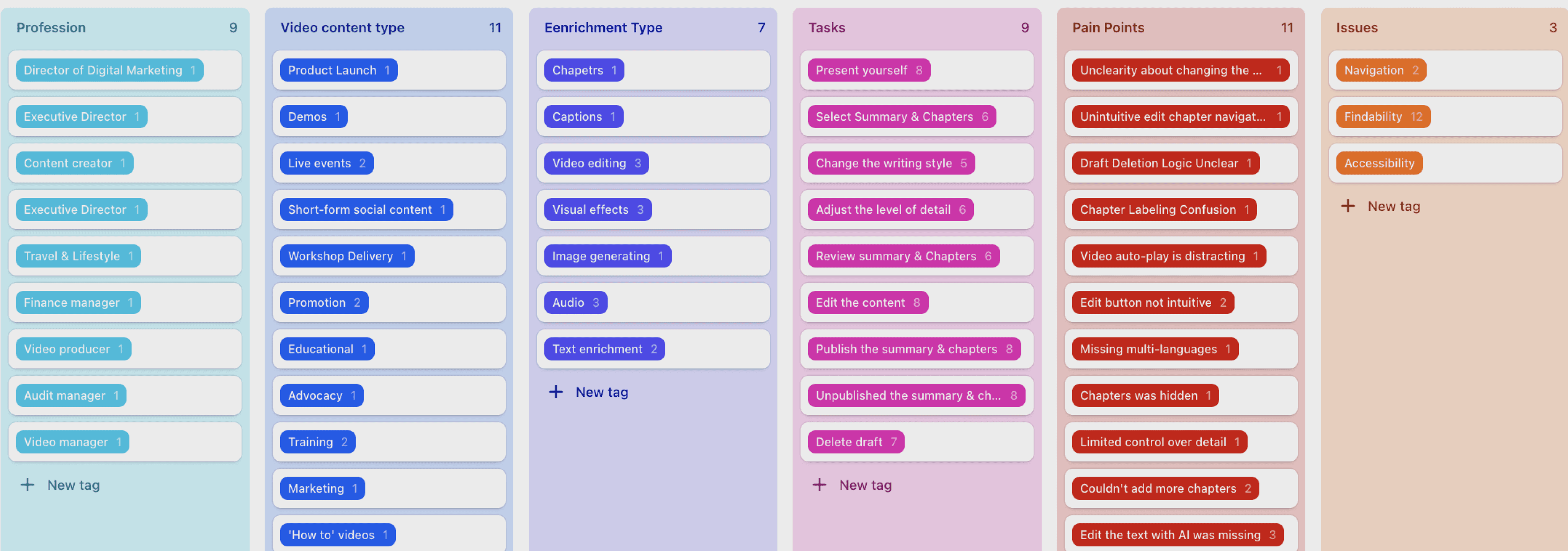 After reviewing all recorded usability sessions in Dovetail, we tagged users’ actions, behaviors, and moments of confusion.